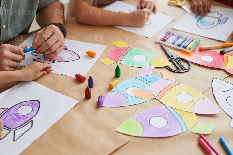 Дети делают космические ракеты в классе искусств и ремесел Close Up