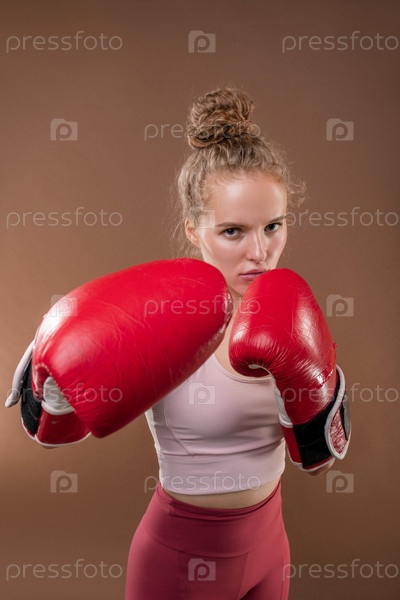 Молодая серьезная активная женщина в спортивном костюме и боксерских перчатках, делающая удары и удары