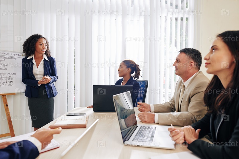 Бизнесмены слушают коллегу на встрече