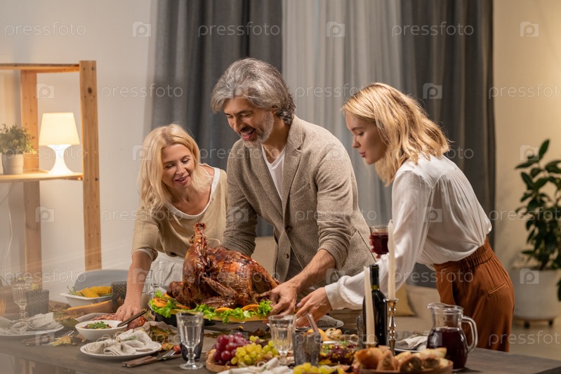 Молодые и зрелые женщины окружают бородатого мужчину с большой жареной индейкой