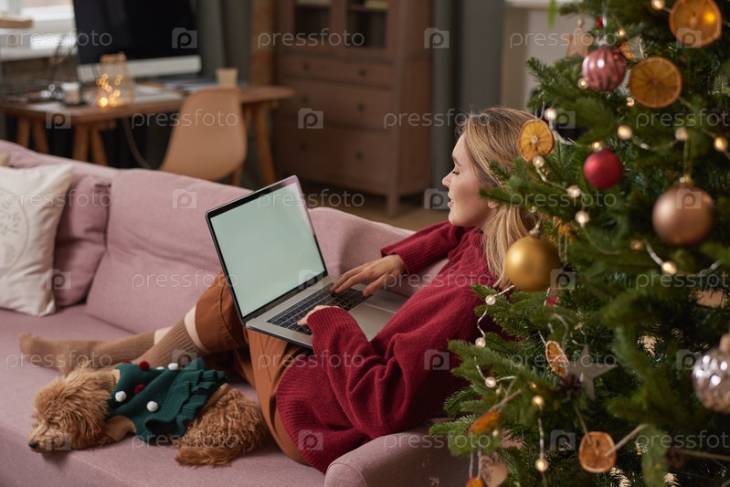 Женщина в стильной теплой одежде проводит рождественское утро дома, отдыхая на диване со своей маленькой собачкой в гостиной и просматривая Интернет