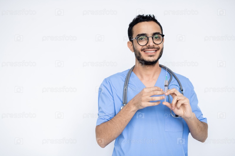 Счастливый молодой клиницист-мужчина с зубчатой улыбкой собирается сделать укол