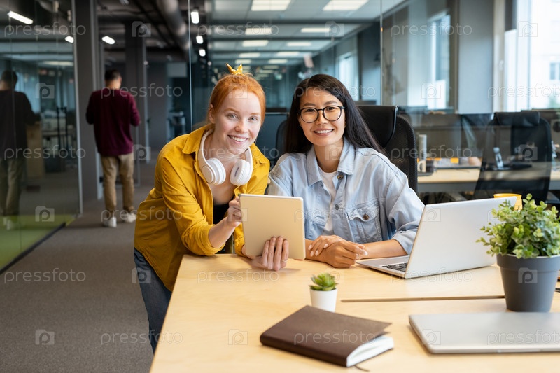 Две молодые межкультурные женщины-менеджеры с зубчатой улыбкой смотрят на вас