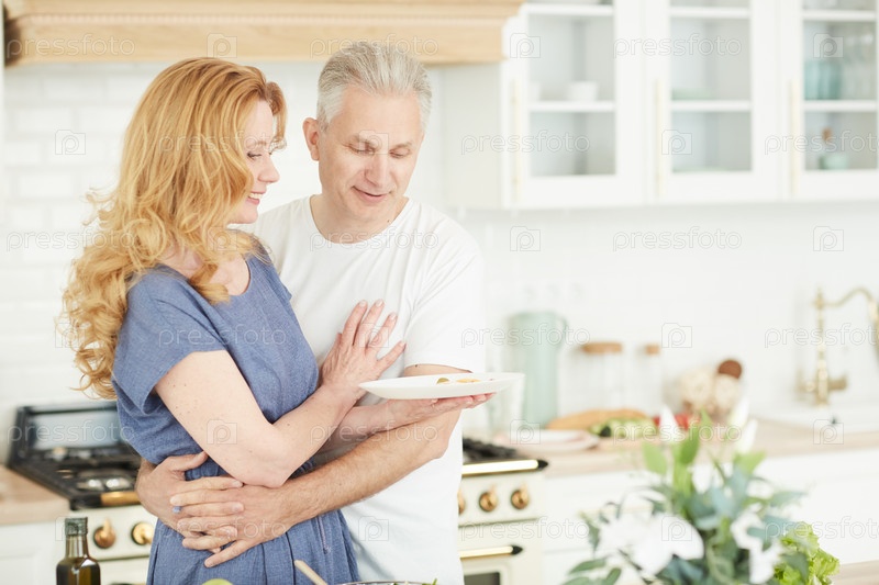 Любящая зрелая пара на кухне