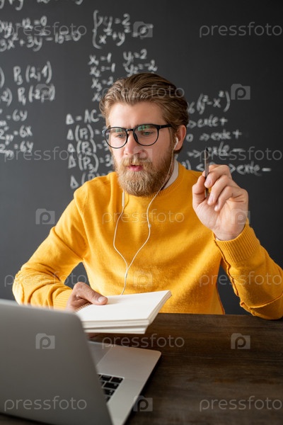 Молодая улыбающаяся учительница с наушниками машет рукой одному из онлайн-студентов