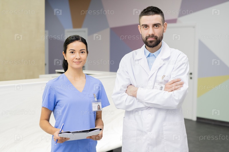 Уверенный в себе врач и его помощник, стоящие в гостиной стоматологической клиники