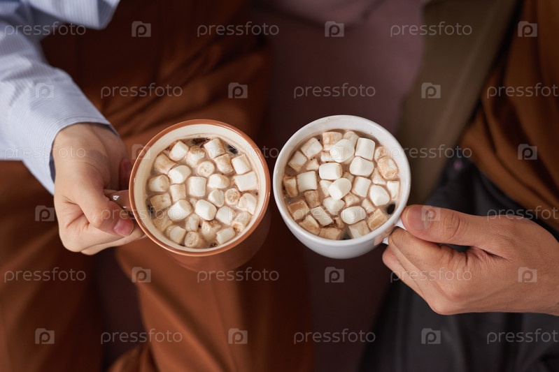 Сверху снимок мужской и женской рук, держащих чашки горячего кофе с зефиром