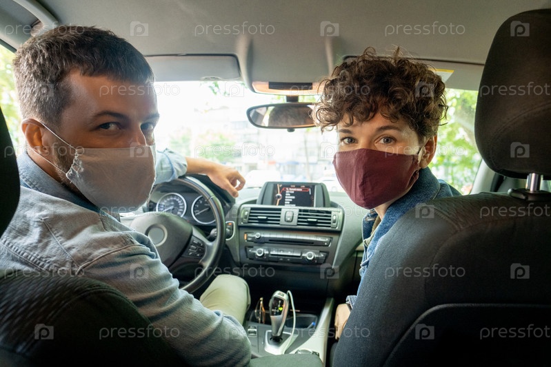 Современная молодая пара в джинсовых куртках и защитных масках едет на машине