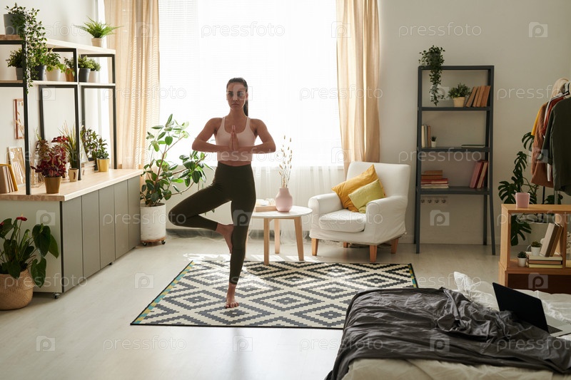 Практика позы на дереве в уютной гостиной