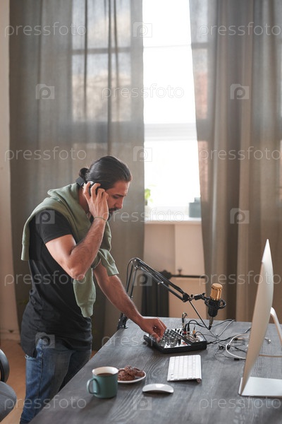 Вертикальный длинный снимок молодого бородатого влиятельного человека, регулирующего звук в домашней студии перед началом съемки контента для блога