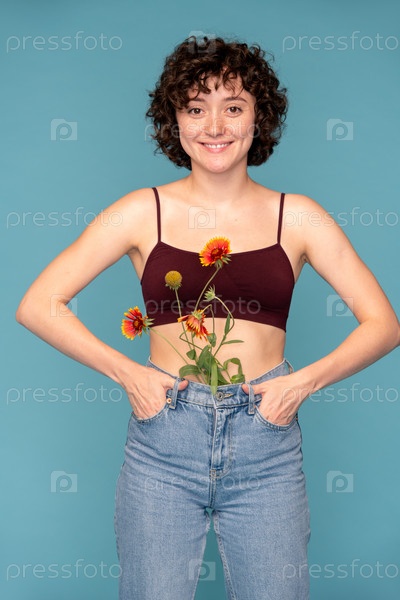 Молодая довольно веселая брюнетка с букетом диких цветов в синих джинсах