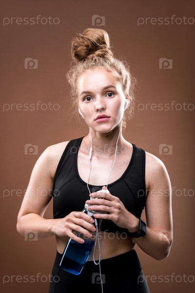 Молодая женщина в наушниках и черном спортивном костюме держит бутылку с водой