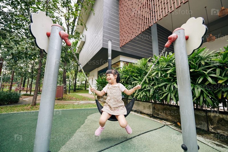 Взволнованная девушка качается на детской площадке