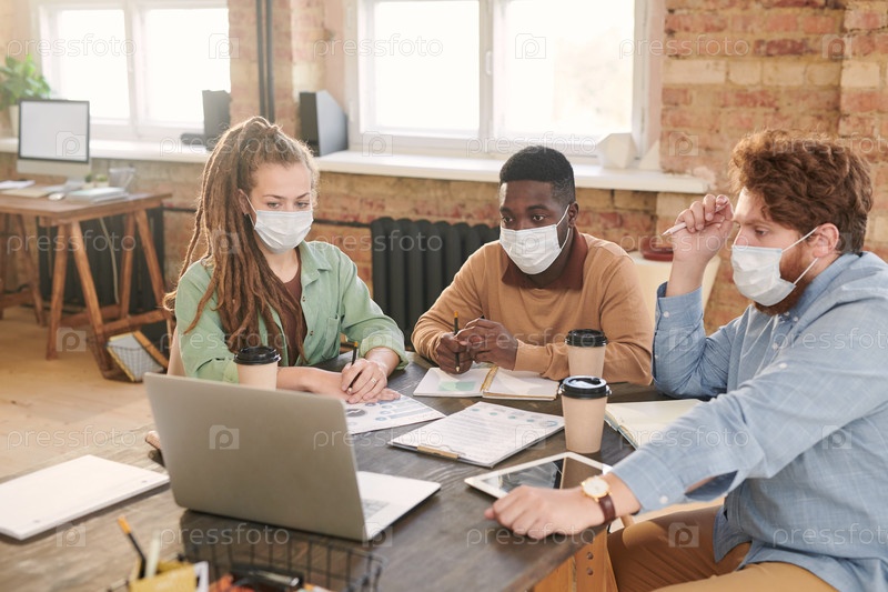 Серьезные молодые мультиэтнические люди в масках сидят за столом и слушают коллегу с помощью приложения видеоконференцсвязи на ноутбуке во время эпидемии коронавируса