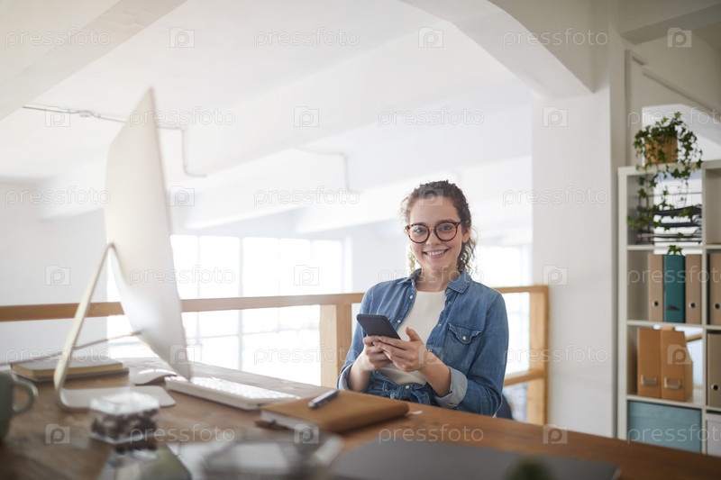 Улыбающаяся молодая женщина наслаждается работой в офисе