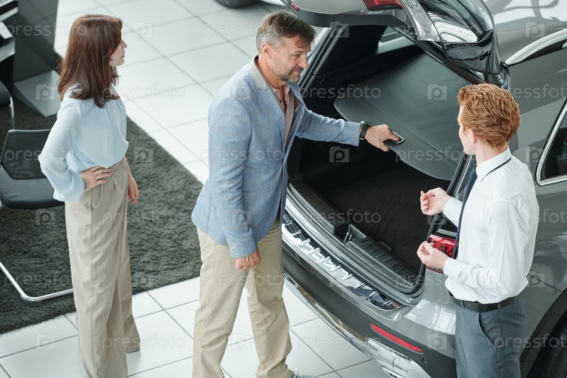 Зрелый клиент стоит у открытой задней части новой машины, консультируясь с менеджером