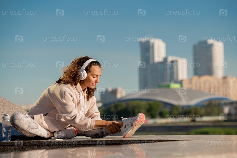 Молодая брюнетка-спортсменка в активной одежде и наушниках растягивает ногу