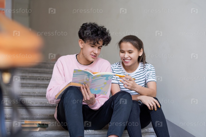 Умный мальчик и девочка указывают на страницу копирайтерской книги, обсуждая заметки лекций
