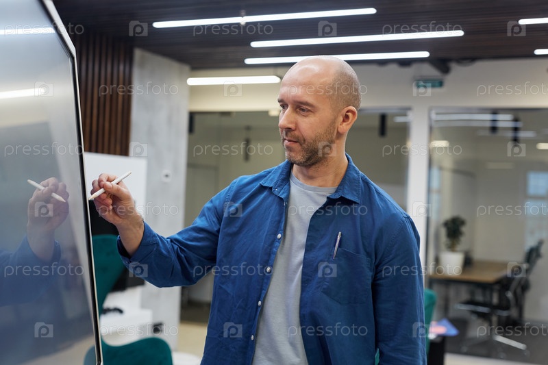 Взрослый лысый мужчина, использующий цифровую панель экрана