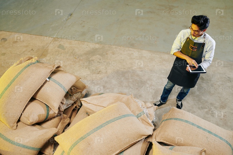 Владелец обжарки, работающий на складе