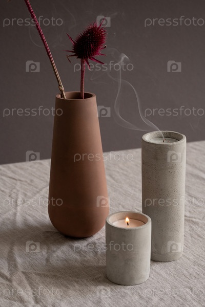 Композиция в стиле хугге, состоящая из двух свечей и глиняной вазы или кувшина с цветами