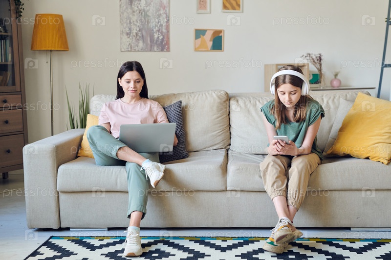 Молодая женщина в сети, пока ее дочь в наушниках прокручивает смартфон