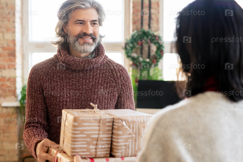 Счастливый зрелый мужчина проходит мимо своей жены с упакованными коробками для подарков, глядя на нее