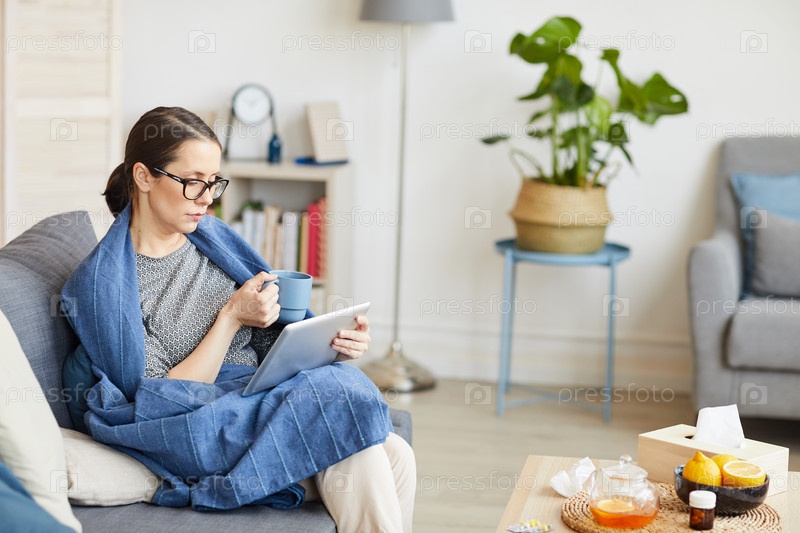 Женщина с планшетным компьютером сидит дома