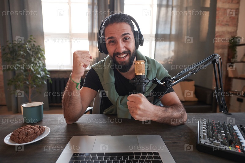 Горизонтальный средний снимок веселого бородатого молодого ближневосточного влиятельного человека в повседневной одежде, сидящего за столом один и наслаждающегося чем-то