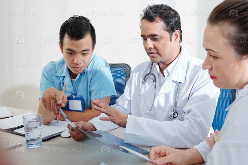 Медицинские работники обсуждают рентгеновское изображение легких