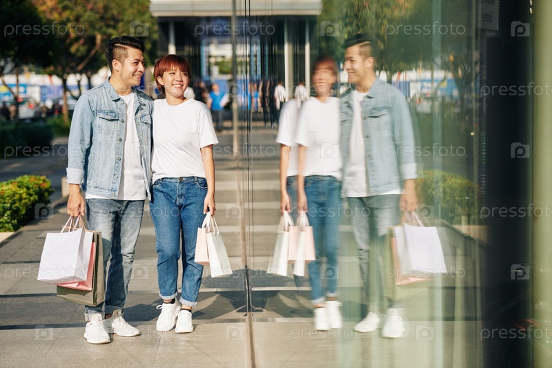 Пара смотрит на витрины магазинов