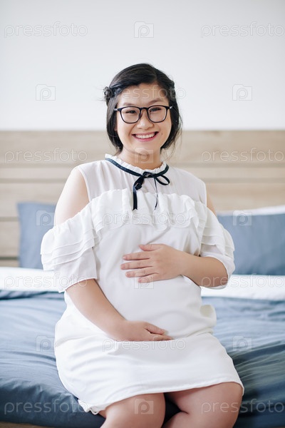 Беременная женщина сидит на кровати