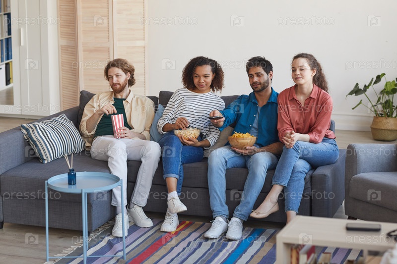 Мультиэтническая группа друзей смотрят фильм дома