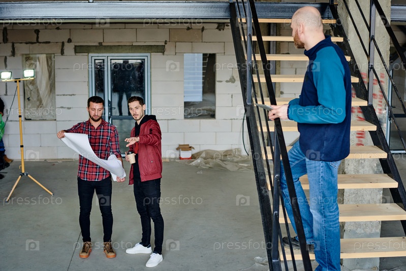 Два молодых инженера с чертежом обсуждают детали эскиза на встрече