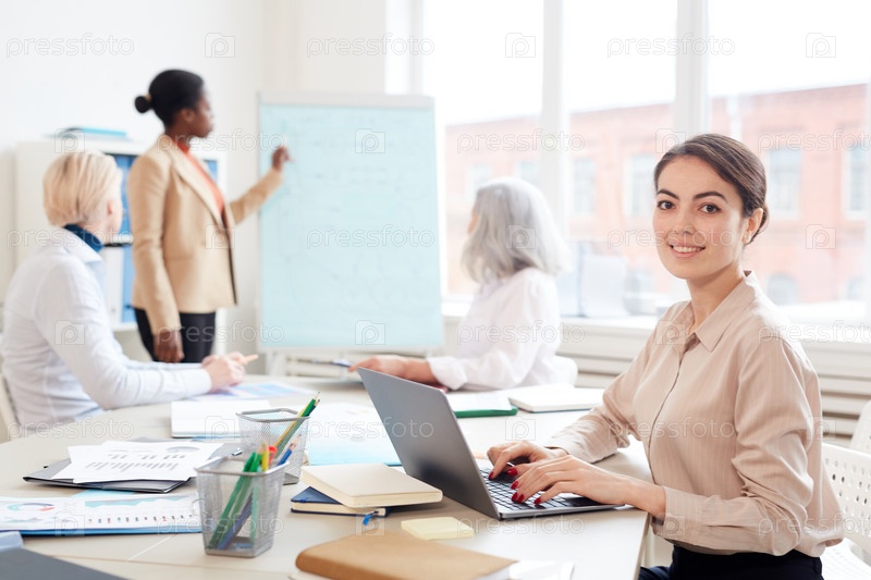 Молодая бизнесвуменка позирует за столом совещания