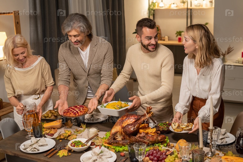 Четыре члена большой семьи ставят домашнюю еду на стол перед праздником