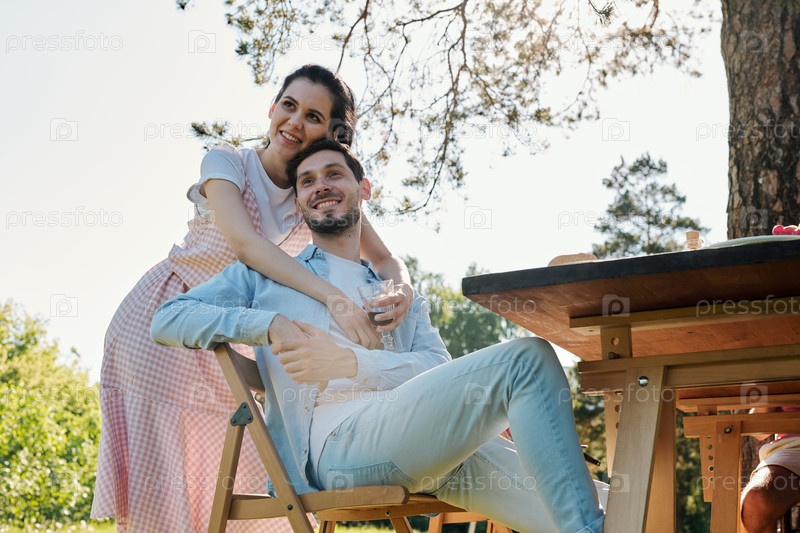 Счастливая молодая ласковая брюнетка обнимает улыбающегося парня