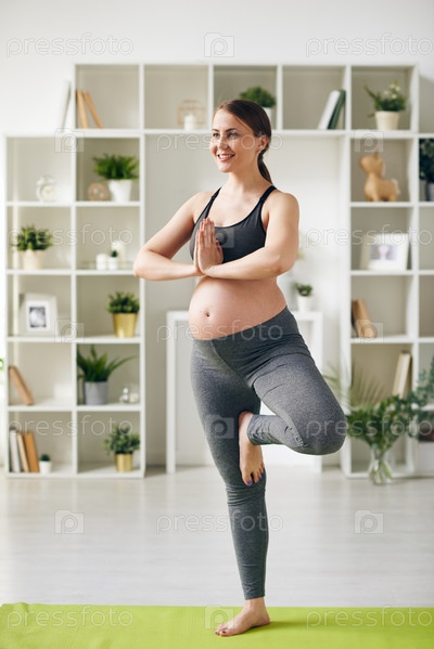 Счастливая молодая беременная спортсменка, стоящая на одной ноге на матке