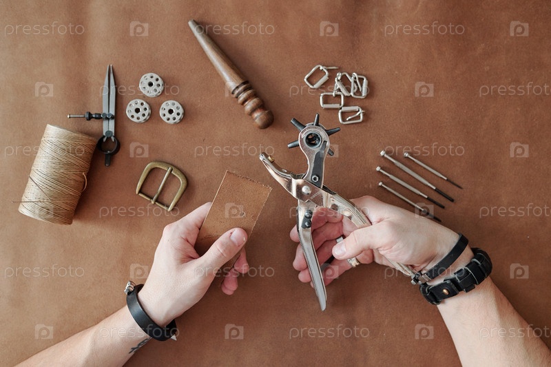 Вид сверху на руки мастера в браслетах, держащих инструмент для дырки