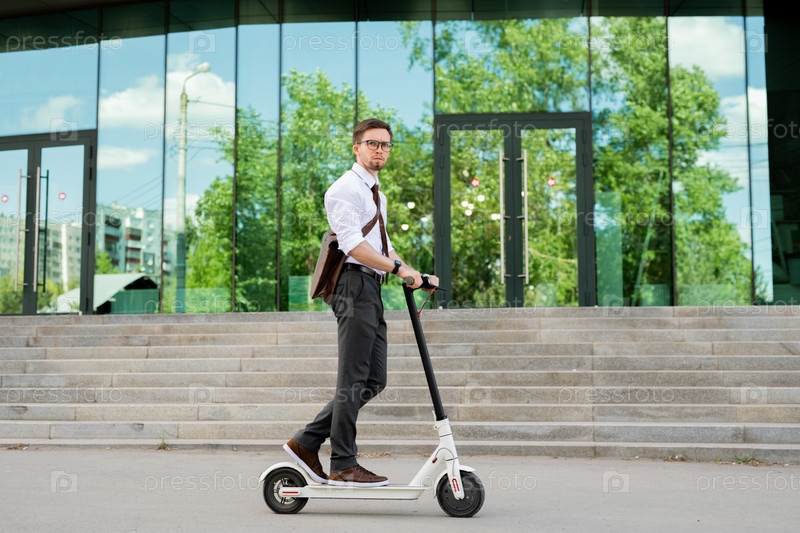 Молодой элегантный бизнесмен стоит на скутере и переезжает в кафе или домой