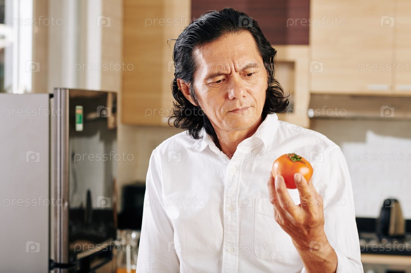 Размышляющий мужчина смотрит на помидор
