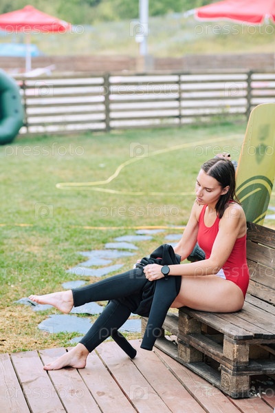 Красивая спортсменка с темными волосами, надевающая черные носки перед серфингом