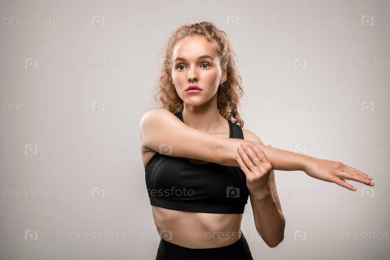Фитнес-спортсменка в черном спортивном костюме, протягивающая перед собой правую руку