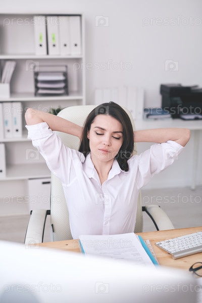 Молодая безмятежная женщина-менеджер офиса отдыхает в кресле у стола
