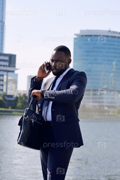 Молодой элегантный африканский бизнесмен или агент консультирует клиента по мобильному телефону