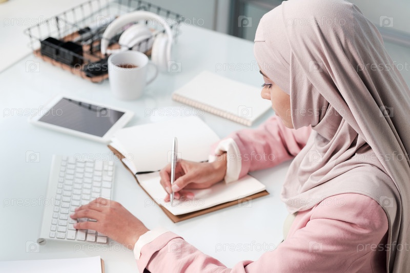 Современная молодая мусульманка в хиджабе и умной повседневной одежде делает заметки