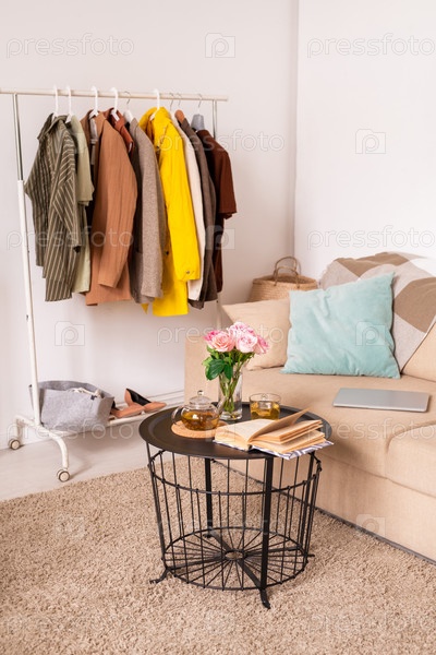 Ряд повседневной одежды, висящей на полке вдоль стены рядом с диваном и маленьким столом