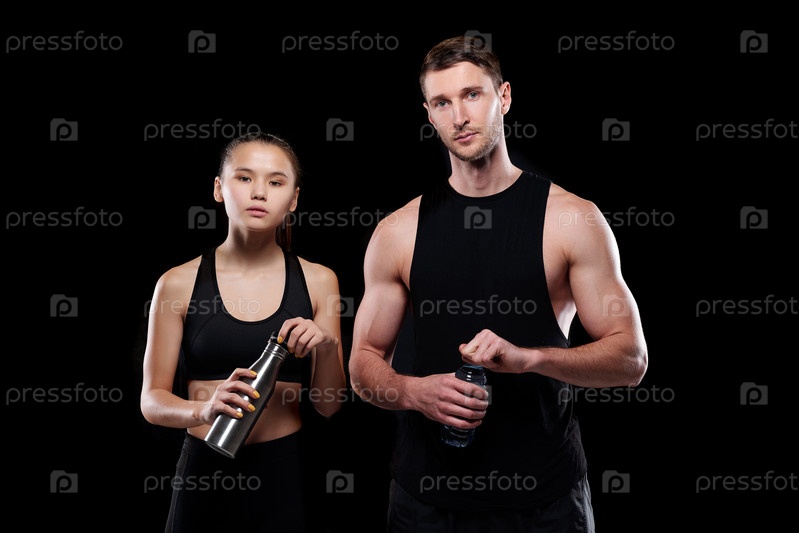 Красивая девушка и мускулистый спортсмен в активной одежде, держащий бутылки с водой