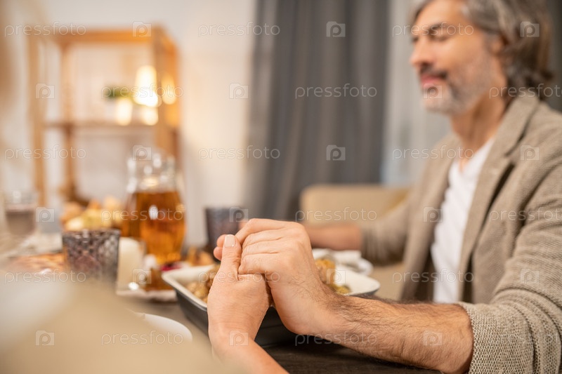 Руки зрелого мужчины с закрытыми глазами и его жена молятся у подаваемого стола
