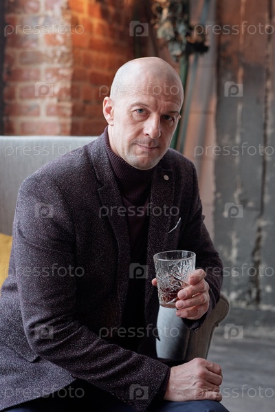 лысый бизнесмен со стаканом крепкого алкоголя